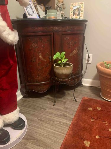 This is a vintage-style bowfront commode or sideboard featuring a dark reddish-brown lacquered finish with intricate Chinoiserie hand-painted decorations. The cabinet is constructed with two curved cabinet doors that follow the bowfront silhouette, supported by short, carved cabriole legs. The exterior is adorned with floral motifs, gold-toned scrolling vines, and depictions of birds, suggesting a 20th-century revival of 18th-century European lacquerware styles. The top surface appears to be a dark material, possibly black lacquer or painted wood, providing a stark contrast to the reddish body. Noteworthy physical characteristics include the ornate apron with floral detailing and the small metal keyhole hardware on the center seam of the doors. While specific maker's marks are not visible from this angle, the style suggests a high-quality decorative furniture piece likely manufactured in the mid-to-late 20th century. The condition appears fair to good with some visible scuffing and age-related wear along the base and legs, where the dark finish has thinned or chipped. The overall craftsmanship displays a sophisticated application of layered paint and gilding, characteristic of specialty accent furniture designed to emulate traditional Asian aesthetic influences in a Western furniture form.