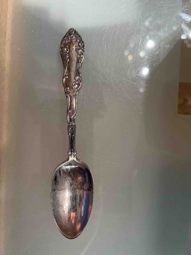 This is an antique teaspoon featuring a highly decorative handle in a Rococo Revival or Neo-Baroque style, characterized by intricate scrollwork, flourishing acanthus leaves, and floral motifs. The spoon appears to be made of silver-plated base metal, likely nickel silver or brass, as evidenced by the high-tarnish areas and potential plating wear. The handle is deeply embossed with high-relief details, terminating in a rounded, ornate tip. The neck of the spoon has a slender, contoured profile that flows into a standard oval bowl. Regarding condition, the piece shows significant atmospheric tarnish and oxidation, particularly within the bowl and the recessed areas of the handle's ornamentation. There are visible surface scratches and 'flea bites' consistent with age and regular use. The dark, uneven patina suggests a high silver content in the plating that has reacted to sulfur over time. While no specific maker's mark is visible from the top view, the level of craftsmanship and design complexity is indicative of mid-to-late 19th or early 20th-century American or European flatware production, such as those by manufacturers like Gorham, Reed & Barton, or Wallace. There are no signs of structural repair, but proper professional cleaning would be required to assess the full integrity of the plating beneath the heavy oxidation.