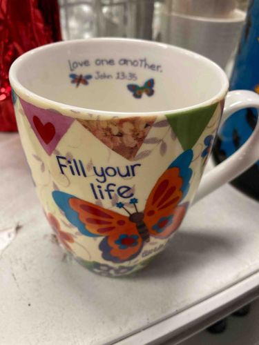 This is a contemporary ceramic coffee mug featuring a collage-style wrap-around design with a cream-colored base. The exterior is decorated with vibrant multi-colored motifs including a large orange and blue butterfly, floral elements, and a triangular bunting banner containing a red heart and textured patterns. The phrase 'Fill your life' is printed in a stylized blue serif font on the side. A unique design feature is the interior printing on the rim which displays the scripture 'Love one another. John 13:34' accompanied by two small butterfly graphics. The mug is constructed from glazed stoneware or porcelain with a standard C-shaped handle and a slightly tapered cylindrical body. The condition appears excellent with a high-gloss finish, no visible chips, cracks, or crazing, though light shelf wear may be present on the unglazed bottom ring. This item is representative of the modern Christian giftware market, specifically produced by Divinity Boutique (item code 25997), emphasizing colorful, inspirational themes and mass-market craftsmanship suitable for everyday use.
