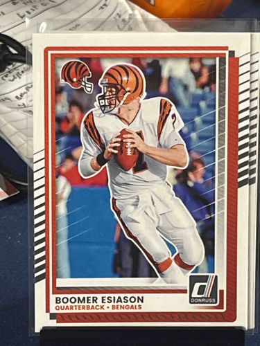 This is a standard 2.5-by-3.5-inch trading card featuring Cincinnati Bengals quarterback Boomer Esiason. The card is produced by Donruss as part of their 1991 series, identifiable by the distinctive red border and graphic 'sawtooth' or diagonal stripe detailing on the sides. The front of the card shows a high-action color photograph of Esiason in his white away jersey and iconic tiger-striped helmet, clutching a football. At the bottom, his name, position, and team are printed in clean, sans-serif typography next to the vintage 'Donruss' logo in a black square. The card appears to be in very good to excellent condition, protected by a clear plastic sleeve which has helped preserve the sharp corners and edges. No visible creases, staining, or surface scratches are present in the provided image. The printing shows strong color registration, particularly the vibrant orange and black of the Bengals' branding. This card represents a significant 'junk wax' era collectible from a period where card production was at its peak.