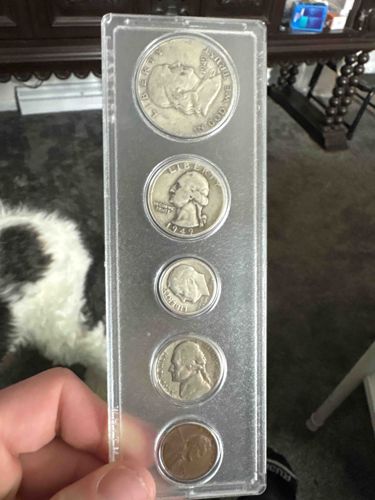 This is a five-piece 1949 United States circulation coin set presented in a vertical, clear hard plastic aftermarket holder. The set includes a Roosevelt Dime, a Washington Quarter, and a Benjamin Franklin Half Dollar, all minted in 90% silver, along with a copper-nickel Jefferson Nickel and a bronze Lincoln Wheat Cent. Each coin clearly displays the 1949 date. Physically, the coins exhibit a varied level of circulation wear and surface oxidation. The silver coins show moderate toning and some contact marks, while the Lincoln cent appears to have a darker brown patina common for copper of this era. The Franklin Half Dollar, at the top, shows some softening of the hair details on the obverse. The Washington Quarter shows a slightly uneven strike or wear pattern on the rim. The Jefferson Nickel and Roosevelt Dime appear to be in average circulated or low uncirculated condition, though fine surface scratches are visible through the plastic. The clear plastic holder provides protection but shows some surface scuffing from handling. This set represents a snapshot of American post-WWII currency, featuring several designs that were relatively new at the time (the Franklin Half having been introduced just the year prior in 1948).