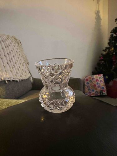 This item is a clear, heavy lead crystal vase significantly characterized by its thistle-shaped silhouette, often associated with the 'Thistle' pattern produced by prestigious makers like Waterford. The piece features a distinct bulbous lower body that transitions into a cinched waist before flaring out into a wide, conical neck with a jagged, sawtooth-cut rim. Its exterior is decorated with intricate deep-cut geometric facets, including a diamond-pattern (hobnail or cross-cut) design that covers the majority of the surface, creating high brilliance and light refraction. The glass appears to be of high lead content, indicated by its clarity and the sharp precision of the cut edges. Structurally, the vase stands approximately 4 to 6 inches tall with a weighted base for stability. In terms of condition, the crystal shows a high degree of transparency without visible clouding or significant 'sick glass' syndrome, though careful inspection of the sharp sawtooth rim is recommended to identify any micro-chipping common in vintage cut glass. No maker's mark is immediately visible in the photograph, but such pieces often feature an acid-etched signature on the base. Based on the style and craftsmanship, this piece likely dates from the late 20th century, representing classic European crystal-cutting traditions known for both durability and aesthetic luxury.