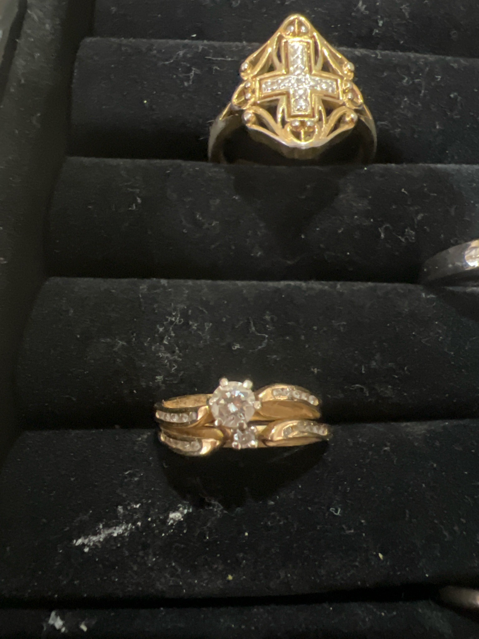 This collection features two distinct pieces of jewelry resting in a black velvet display. The primary piece is a bold, 10-karat or 14-karat yellow gold ring featuring an ornate architectural cross motif. The cross is pavé-set with small round white stones (likely diamonds or cubic zirconia) and is framed by openwork filigree borders. Below it sits a bridal wedding set consisting of a round brilliant-cut center stone held by four prongs, flanked by two matching yellow gold contoured bands. These bands are inlaid with small channel-set accent stones that mirror the brilliance of the center gem. The gold shows a warm, polished luster with minor surface abrasions consistent with light wear. The craftsmanship on the cross ring suggests a contemporary or late 20th-century religious design, while the wedding set follows a classic mid-to-late 20th-century aesthetic. No visible hallmarks are shown in the image, but the construction indicates mass-produced fine jewelry. The condition appears good, with stones securely set and no deep gouges or structural failures visible to the naked eye.