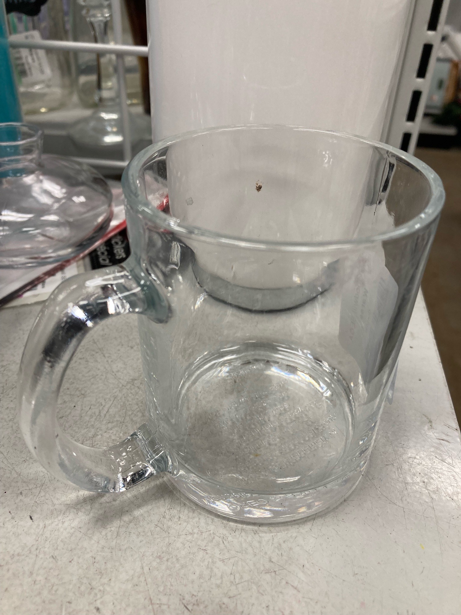 This item is a clear glass mug specifically designed for the Oreo brand. It features a standard cylindrical body with a thick-walled construction, typical of soda-lime glass drinkware. The mug includes a prominent, C-shaped glass handle attached via heat fusion at the top and bottom. A defining characteristic of this specific piece is the molded branding; the 'OREO' logo is embossed in reverse on the bottom center of the glass, intended to be visible through the liquid or when the mug is inverted. This particular design was commonly part of promotional gift sets produced in the late 1990s through the early 2000s, often paired with milk dunking kits. The craftsmanship is industrial-grade with visible mold seams running vertically down the sides and along the handle. Regarding condition, the glass shows light scuffing on the exterior surface and some mineral clouding near the base. There is a small dark speck or inclusion visible in the glass wall, which appears to be a manufacturing artifact rather than damage. No significant chips, cracks, or deep abrasions are present on the rim or base, indicating fair to good vintage condition.