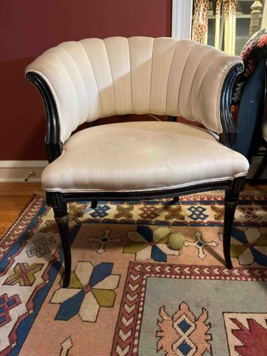 This item is a refined French Empire style barrel back chair, estimated to be from the 1960s. The chair features a distinctive curved barrel-back design, which is upholstered in a light, possibly cream or pale ivory, fabric with a subtle textured or ribbed pattern. The upholstery on the back is meticulously channeled or fluted, creating a fanned, shell-like appearance that adds a touch of classic elegance. The wooden frame of the chair is finished in a dark, likely ebonized or dark stained wood, providing a striking contrast against the pale upholstery. The arms, which seamlessly flow from the curved back, are substantial and decorative, featuring a carved scroll or volute detail at their terminus before meeting the seat. The chair's legs are turned and tapered, ending in what appear to be small, possibly gilded or brass, cap feet. There are observable decorative elements on the frame and legs, including what looks like reeding or carved motifs that contribute to its Empire aesthetic. The trim around the base of the seat cushion and along the top edge of the backrest could include decorative cording or nailhead embellishments, though closer inspection would be required to confirm. The overall condition is described as excellent, with the notable mention that the upholstery is slightly soiled, suggesting minor surface discoloration consistent with age and use but no significant rips or tears. The craftsmanship appears to be of high quality, indicative of a well-made piece with attention to detail in both carving and upholstery.
