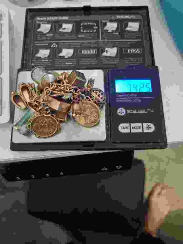 A substantial yellow gold charm bracelet, likely 14k or 18k based on the deep hue, currently resting on a digital jeweler's scale displaying a total weight of 74.25 grams. The bracelet features a large, heavy-link curb-style chain that serves as the foundation for several oversized, high-relief charms. Notable charms include two large commemorative-style gold coins or medallions (one possibly being a British Sovereign or similar currency, mounted in a decorative bezel) and a pair of articulating gold slippers or shoes. The craftsmanship suggests a mid-20th-century origin, approximately 1950s to 1970s, which was the peak era for heavy, custom-curated gold charm bracelets. The construction involves solid cast elements and hand-assembled jump rings. To the touch, the item appears well-worn with a soft satin patina and minor surface scratches consistent with age and frequent use. There are no immediately visible missing components or broken links. The scale shown is a 'Scalability' brand digital pocket scale, which is typically used for precision metal weighing. Given the gross weight of 74.25g, this is a premium investment-grade piece of jewelry that holds significant intrinsic value in gold content alone, in addition to its collector value as a vintage accessory.