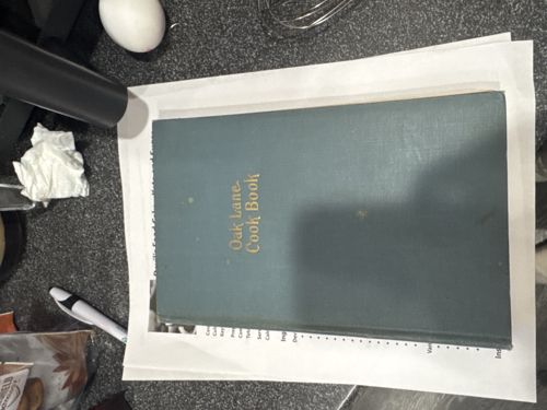 This is a vintage hardcover cookbook titled 'Oak Lane Cook Book', likely a regional or community-published culinary collection. The item features a teal or forest green cloth-bound cover with a textured, matte finish. The title is centered on the front cover in gold-toned embossed lettering, arranged in a three-line, sans-serif or slightly stylized font. In terms of size, it appears to be a standard octavo or slightly smaller format, common for early to mid-20th-century community books. The construction includes a stitched binding which shows some slight rounding and wear at the spine ends. Visible condition issues include localized staining on the front cover, specifically a dark spot to the left of the title and various surface abrasions. The edges and corners of the boards exhibit minor fraying and shelf wear. There is no visible dust jacket, which is common for these types of utilitarian communal volumes. The paper quality within is likely a standard pulp or offset paper of the era. This style of book was popular in the 1920s through the 1950s as a way for church groups or neighborhood committees to consolidate local recipes. The craftsmanship is modest but durable, designed for frequent handling in a kitchen environment.