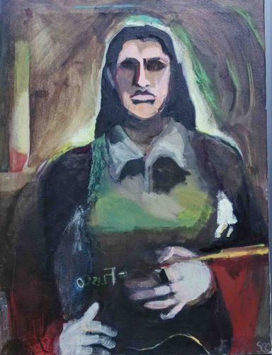 This original work of art is a medium-scale figurative oil or acrylic painting on canvas, depicting a woman in a seated portrait composition. The style is heavily influenced by Expressionist techniques, characterized by bold, visible brushwork and a somber, muted color palette consisting primarily of deep blacks, earthy browns, forest greens, and terracotta reds, contrasted against the pale flesh tones of the subject's face and hands. The subject features dark, elongated hair and a concentrated, stoic facial expression with heavily shadowed eyes. She is wearing a collared garment under a darker outer layer. A notable feature is the white text 'Fusco' appearing horizontally across the mid-section, which may be a label, name, or part of the artist's thematic composition. There is a small 'SCO' or 'SC' monogram in the lower right corner, likely representing the artist's signature. The canvas shows a textured weave throughout the paint layers. The craftsmanship displays a confident, gestural hand, focusing on light and shadow rather than fine detail. Condition appears stable, though there are slight irregularities in the paint application consistent with the artistic style, and some visible wear along the vertical edges of the canvas where it may have rubbed against a frame. The overall aesthetic suggests a late 20th-century origin, echoing mid-century European modernism.