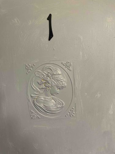 This item is a white neoclassical-style bas-relief plaque featuring a profile portrait of a woman, likely a deity or allegorical figure such as Minerva or a Muse. The plaque is integrated onto a flat, textured surface, possibly a wall or door, finished in a light grey or off-white paint. The relief is rectangular with an oval interior frame containing the bust, accented by scrollwork filigree at the four corners. The figure is depicted with elaborate, draped clothing and a flowing, highly detailed hairstyle including a laurel-like headband. Above the relief is a black metal stylized numeral '1', suggesting this plaque serves as a decorative room or apartment identifier. The construction appears to be molded plaster or resin, subsequently painted. Condition-wise, the item shows visible brushstrokes from repainting, indicating it has been maintained in situ over time. There are minor imperfections and possible paint buildup in the finer details of the relief, but no major structural cracks are visible. The style is 20th-century revival of classical 18th-century aesthetics, often found in residential decor to provide an air of sophistication and historical weight.