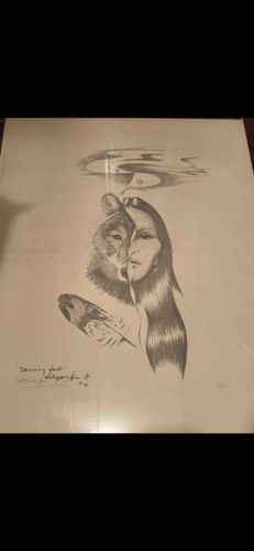 This is a monochrome figurative illustration titled "Dancing Ghost," rendered in what appears to be graphite or fine charcoal on a white or light-cream paper substrate. The artwork features a surrealist, split-portrait composition where the left side depicts the profile of a wolf and the right side depicts the face of an Indigenous woman with long, dark hair. Below the central figures is a detailed rendering of a feather featuring its own internal wolf-head motif. Above the central figures, ethereal wisps of smoke or spirit-clouds drift upwards. The execution demonstrates high-quality craftsmanship with fine stippling on the wolf's fur and smooth gradient shading on the woman’s skin. The bottom left corner contains the handwritten title in quotes, followed by the artist's signature "Waterfire" and the number "91", suggesting the piece was created in 1991. The paper shows contemporary age with no visible foxing, though there are minor reflections on the surface suggesting it may be stored in a plastic sleeve or under glass. The style is characteristic of late 20th-century visionary or Native American-influenced realism.