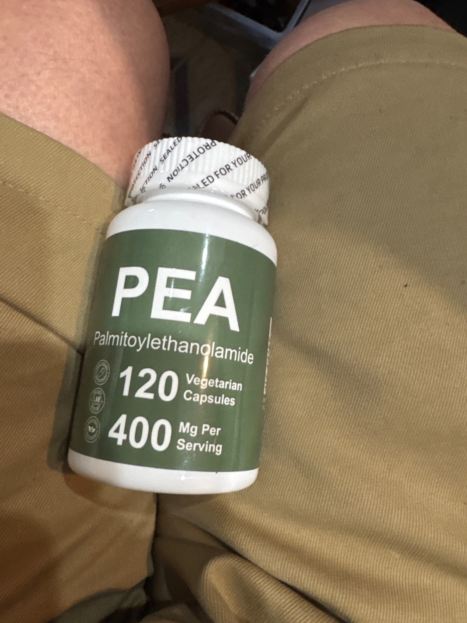 This item is a standard-sized, white opaque high-density polyethylene (HDPE) plastic bottle containing dietary supplements. The container features a wrap-around adhesive label with a secondary olive-green background. Prominently displayed in large, sans-serif white font is the acronym 'PEA', followed by the full chemical name 'Palmitoylethanolamide'. Technical specifications on the label indicate a quantity of 120 vegetarian capsules with a dosage of 400 mg per serving. On the left side of the label, several quality icons are visible, including a 'Lab Tested' seal and a leaf icon suggesting botanical or natural sourcing. The bottle is fitted with a white, ribbed screw-top cap that remains factory-sealed with a white plastic perforated shrink-wrap band. This safety band features repeating black text reading 'SEALED FOR YOUR PROTECTION'. The bottle appears to be in new, unused condition with no visible scuffs, tears to the label, or degradation of the plastic. Based on the graphic design and typical shelf life of such products, it likely dates from the early 2020s. The manufacturing style suggests a modern, commercial-scale production facility utilizing standardized pharmaceutical-grade packaging materials. The overall presentation is professional and functional, typical of contemporary health and wellness industry standards.