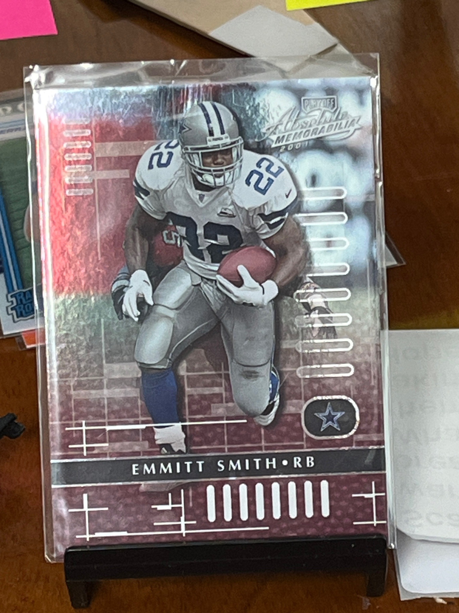 This is a 2001 Playoff Absolute Memorabilia football card featuring Hall of Fame running back Emmitt Smith (Number 22) of the Dallas Cowboys. The card measures standard 2.5 by 3.5 inches and is constructed from premium high-gloss cardstock. The design utilizes a distinctive silver foil and red prismatic aesthetic, common for early 2000s high-end sports cards. The front of the card displays Smith in his away white jersey carrying a football, set against a multi-textured background featuring a die-cut reminiscent border and 'Playoff Absolute Memorabilia 2001' branding in the upper right. Smith's name and position (RB) are printed in a black horizontal bar across the bottom. The card appears to be in a clear soft sleeve and top loader for protection. Notable features include intricate grid-like foil patterns and the iconic Cowboys star logo at the bottom right. Under visual inspection, the card edges and corners appear sharp through the sleeve, with no immediate signs of surface scratching or moisture damage. The centering looks slightly heavy towards the left side. This card represents a modern-era collectible from Smith's late-career period with Dallas.