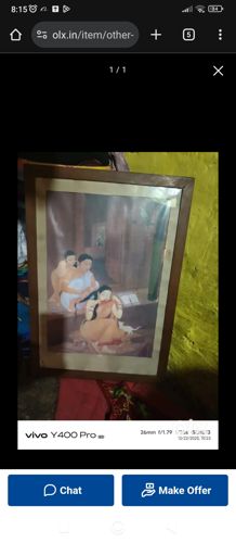 This is a vintage Indian mythological or domestic print housed in a traditional wooden frame with a simplistic flat profile. The artwork depicts three female figures in a domestic interior setting, evocative of the realistic oily style popularized by Raja Ravi Varma in the late 19th and early 20th centuries. The central figure is seated on the floor, while two others are positioned behind her, set against a backdrop of architectural elements and pillars typical of high-class Indian households of the period. The palette consists of warm earth tones, soft whites, and flesh tones, creating a serene, intimate atmosphere. The print appears to be a mass-produced lithograph or oleograph, which were common in Indian homes from the 1920s through the mid-20th century. Physically, the item shows signs of age congruent with its vintage status, including light foxing on the paper and some potential fading due to UV exposure. The frame is basic, possibly teak or a similar regional hardwood, showing minor scuffs and a dull patina. There are no immediate maker's marks visible in the low-resolution image, but such pieces were often printed by the Ravi Varma Press or similar commercial lithographic printers in Mumbai or Germany. The overall composition displays the intersection of Indian cultural themes with Western academic realism.