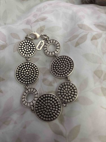 This is a contemporary fashion jewelry piece by the brand Alfani, featuring a textured link design. The bracelet consists of seven circular links of varying sizes, connected by small jump rings. Most of the links feature a raised, geometric mosaic or 'waffle' pattern with darkened (oxidized) recessed areas to create high-contrast shadows, giving it a modern, architectural aesthetic reminiscent of Greco-Roman pavement or Brutalist textures. Two of the links are open-center rings with matching textured borders. It is constructed from a silver-toned base metal, likely a zinc alloy or pewter, with a polished finish on the raised surfaces. The piece is secured with a standard lobster claw clasp and includes a metallic hanging tag stamped with the 'ALFANI' maker's mark. The condition appears very good with no visible missing finish or significant scratches; the darkening in the patterns is an intentional stylistic patina rather than wear. The craftsmanship is typical of high-end department store costume jewelry, displaying clean casting and uniform proportions across the geometric elements. This style is consistent with early 21st-century modern fashion trends.