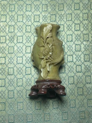 Chinese Hand-Carved Soapstone Vase with Floral High-Relief