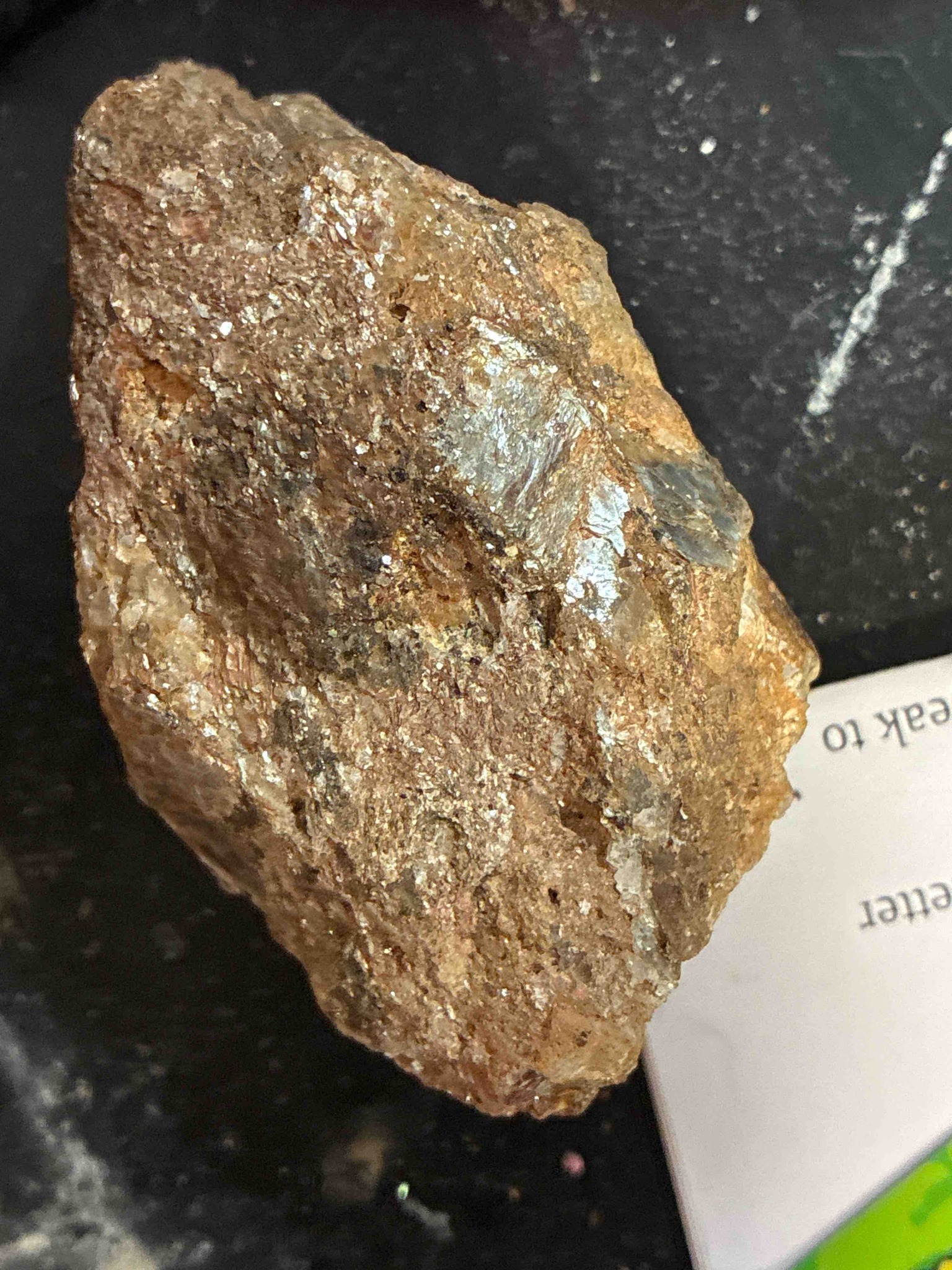 This is a raw, natural mineral specimen, likely a pegmatitic rock rich in mica minerals such as lepidolite or muscovite, potentially associated with quartz or feldspar. The specimen displays a rugged, irregular geological structure with a predominantly earthy bronze, tan, and brownish-gold color palette. Its most notable physical characteristic is the high concentration of phyllosilicate minerals, which create a glittering, pearly, or sub-metallic luster across the surface as light reflects off the thin, sheet-like cleavage planes. On the upper right quadrant, there is a distinct silvery-blue or lavender-toned crystalline face, a color often indicative of lithium-rich lepidolite. The texture is highly foliated and granular, with visible 'books' of mica integrated into a solid matrix. The condition is raw and unpolished, showing natural conchoidal and uneven fractures typical of mineral extraction. There are no artificial marks or manufacturing stamps, as this is a natural geological occurrence. Its formation is ancient, dating back millions of years within a high-heat igneous environment. The quality of the specimen is characterized by the size and clarity of its mica 'windows' and the subtle play of color between the darker matrix and the iridescent mineral surfaces.