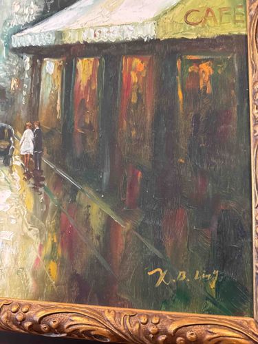 This is an original oil painting on canvas executed in a vibrant Impressionist style, depicting a bustling evening street scene outside a cafe. The composition features a prominent cafe with a yellow and white awning displaying the word 'CAFE' in red lettering. Two figures are seen walking along the wet sidewalk, their forms reflected in the glossy, rain-slicked pavement alongside the warm interior lights of the establishment. The color palette is dominated by deep browns, greens, and ochres, punctuated by bright highlights of white, yellow, and red. The paint is applied with heavy impasto, creating a rich texture and visible brushwork that conveys movement and atmosphere. The work is signed 'X.B. Ling' in the lower right corner in a gold-toned pigment. It is housed in an ornate, molded gilt wood frame featuring acanthus leaf and bead motifs. The overall condition appears good with some minor age-related wear to the frame finish, including small chips and dust accumulation in the crevices. The style suggests a mid-to-late 20th-century creation, typical of decor-oriented Parisian street scenes produced for the commercial art market. The quality of the brushwork shows a confident hand, particularly in the rendering of reflections on the wet street.