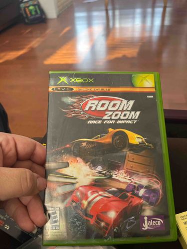 This is an original physical copy of the video game 'Room Zoom: Race for Impact' for the Microsoft Xbox console, released circa 2004. The item is housed in a standard translucent green plastic Xbox keep case, measuring approximately 7.5 by 5.3 inches. The front cover art features high-octane racing imagery with stylized cars in yellow and red traversing a household environment, consistent with the game’s theme of toy car racing. Key branding elements include the 'Xbox' logo in the top banner, the 'Xbox LIVE' online enabled badge, the 'Everyone' ESRB rating, and the logo for the publisher, Jaleco. The physical condition shows signs of moderate wear; the clear plastic sleeve overlay exhibits numerous light surface scratches, scuffs, and some clouding consistent with age and regular handling. There are visible indentations on the top edge of the case. The printed paper insert appears intact without major tears, though there is some slight color fading and minor rippling visible under direct light. This title represents a niche racing game from the sixth generation of video game consoles, valued by collectors of the Jaleco library and original Xbox enthusiasts. The craftsmanship is typical of mass-produced consumer electronics media from the early 2000s.