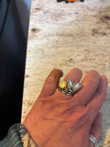 This item is an ensemble of stackable rings featuring a prominent decorative butterfly and a round light-reflective gemstone. The primary ring displays a butterfly design with iridescent wings, likely crafted from mother-of-pearl or a similar shell material, set in a silver-toned metal border that appears to be micro-pave set with small clear stones. Adjacent to the butterfly is a second ring featuring a prong-set round yellow or champagne-colored stone, possibly a citrine, yellow sapphire, or high-quality faceted glass. The base of the stack consists of a textured or pave-set band in a darkened silver or oxidized metal finish. The construction suggests a contemporary fashion or bridge jewelry style, emulating high-end jewelry design. On the pinky finger is a separate wide silver-toned band with a continuous engraved organic or vine-like pattern. All metal surfaces exhibit a polished finish with some visible darkening in recessed areas, consistent with antique-style patination or normal wear. The rings appear to be in good functional condition without missing stones visible from this angle, though slight surface scratches on the metal bands are consistent with use. The ensemble shows a mix of materials and textures, reflecting a bohemian-luxe or eclectic modern aesthetic characteristic of the early 21st century.