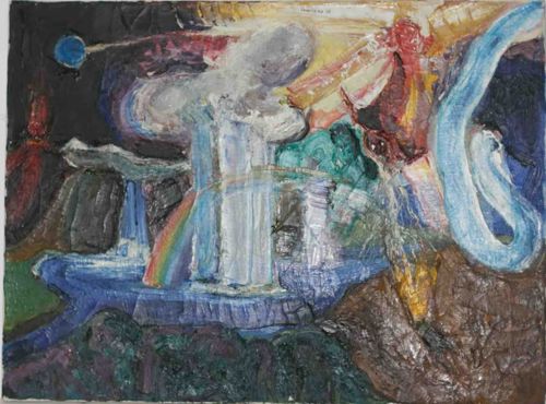 This is an original un-titled abstract painting executed by an unknown artist, likely dating from the mid-to-late 20th century. The work is characterized by heavy impasto and a thick application of mixed media, potentially oil or acrylic with possible collage elements or wax, creating a highly tactile and relief-like surface. The composition is chaotic and energetic, featuring a broad color palette that includes cerulean blue, ochre, deep greens, and a distinct rainbow spectrum diagonally across the lower left. To the right, a serpentine blue form suggests motion, contrasting with the more structural white columnar shapes in the center. The substrate appears to be a board or heavily textured paper, currently unframed with visible raw edges showing some wear and minor pigment loss. A circular blue orb in the top left corner serves as a focal point against a dark background. Notable features include thick, gestural brushstrokes and a layered, 'built-up' construction that indicates an expressive, intuitive process. There is a small indistinct inscription or signature located at the top center edge, though it remains illegible. The overall condition shows some surface cracking consistent with aged, heavy impasto, adding to the piece's raw and visceral quality.