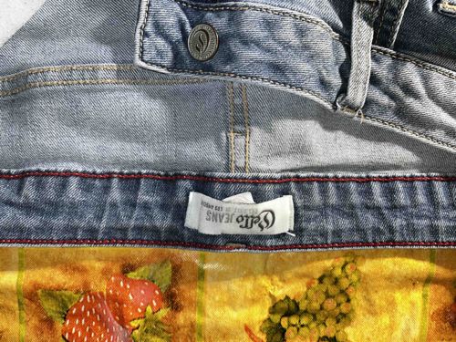 This item consists of a pair of contemporary blue denim pants from the brand Cello Jeans, as identified by the cloth label stitched into the inner waistband. The denim features a light to medium indigo wash with visible 'whiskering' and sandblasting effects that create a faded aesthetic across the fabric. The construction details include a traditional metallic shank button closure at the waist, which appears to be aged bronze or antique copper in tone with an embossed logo. A notable design element is the decorative red contrast stitching along the interior edge of the waistband, which adds a distinct pop of color against the blue denim. The garment includes functional belt loops and light gold or ochre-colored structural topstitching. In terms of condition, the fabric shows general signs of wear consistent with pre-owned apparel, including minor fraying at the edges of the brand tag and some puckering at the seams. The brand tag indicates the company is based in Los Angeles, known for trendy, stretch-denim designs. The overall craftsmanship suggests a mass-market contemporary fashion item likely produced within the last 5 to 10 years.