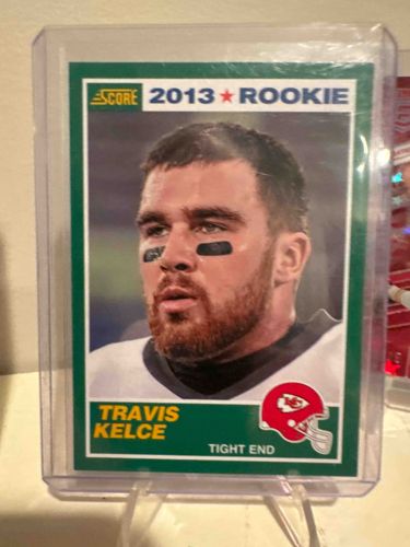 This is an original 2013 Score football trading card featuring Travis Kelce in his rookie year. The card displays a high-resolution portrait of Kelce with eye black, wearing a white jersey against a dark background. The design features a bold green border characteristic of the 2013 Score set. In the top left corner is the 'Score' brand logo, and centered at the top is the '2013 * ROOKIE' banner. The bottom section includes the player's name 'TRAVIS KELCE' in yellow lettering, his position 'TIGHT END' in white, and a graphic of a Kansas City Chiefs helmet on the right. The card is standard 2.5 by 3.5 inches, printed on cardstock with a gloss finish. It is currently housed in a clear protective top-loader and sleeve, which appear to have some surface scuffs and reflections, though the card itself looks to have sharp corners and clean edges based on visual inspection. This piece is a key rookie card for one of the NFL's most decorated tight ends, making it a significant item for modern sports card collectors.