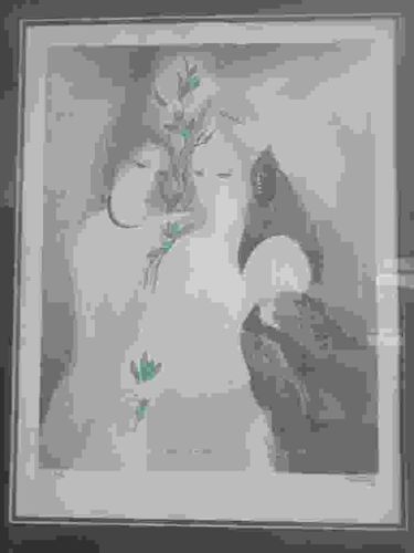 This artwork is a color lithograph on paper by the French artist Marie Laurencin, a central figure in the Parisian avant-garde. The composition features three ethereal female figures rendered in Laurencin's signature 'Fauvette' style, characterized by a soft, pastel palette of muted greys, pinks, blues, and pale greens. The figures exhibit the almond-shaped eyes and simplified, porcelain-like features typical of her work, evoking a dreamlike and feminine atmosphere. The lithograph is presented in a rectangular format, housed within a simple, narrow frame which appears modern. Notable details include the delicate application of secondary color to the floral accents held by the central figure. In the lower margins, there is evidence of an edition numbering on the left and a facsimile signature on the right, which are standard for limited edition lithographic runs. The condition shows some signs of age-related darkening of the paper (toning) and potential minor foxing, though the colors remain recognizable. Laurencin's work from this period (likely mid-20th century) is highly valued for its unique blend of Cubist influence and decorative elegance, representing a distinctively feminine perspective within the School of Paris.