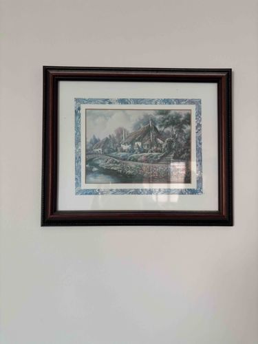 This item is a framed landscape print depicting a scenic, pastoral cottage by a body of water. The central image features a thatched-roof English-style cottage nestled among lush trees and gardens, adjacent to a stone bridge over a calm stream or river. The color palette is dominated by muted greens, browns, and earthy tones with a hazy, overcast sky, characteristic of late 19th or early 20th-century romanticized rural realism. The artwork appears to be a lithographic or offset print rather than an original painting. It is uniquely double-matted; the inner mat is a decorative blue and white filigree pattern that mimics a textile or classic porcelain motif, while the outer mat is a clean, off-white cardstock. The piece is housed in a dark cherry or mahogany-finished wooden frame with a decorative beaded inner lip. The frame appears to be in good vintage condition with minor surface abrasions consistent with age. There is a noticeable glare on the protective glass, but the print itself shows no immediate signs of foxing or moisture damage. The style suggests a mid-20th-century decorative piece intended for domestic interiors, capturing a nostalgic, 'Old World' aesthetic. No visible signature or maker's mark is discernible from the distance of the photograph, which is common for mass-marketed decorative prints of this era.