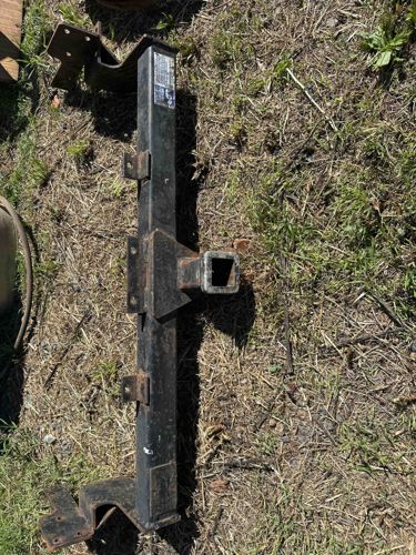 This item is a heavy-duty, frame-mounted tow hitch receiver assembly, likely a Class III or Class IV based on the standard 2-inch square receiver opening. It is constructed from welded square-tube steel and heavy-gauge plate steel, finished in a matte black powder coating or paint. The assembly features a long cross-member bar with integrated mounting brackets at each end, designed to bolt directly to a vehicle's frame rails. A central receiver tube is reinforced with triangular gusset plates for additional structural integrity. A commercial specification sticker is visible on the upper left section of the cross-tube, though the specific manufacturer details are obscured by lighting. Condition-wise, the item shows significant signs of outdoor exposure and use, including surface rust concentrated around the receiver mouth, welding seams, and mounting flanges. There is visible wear to the finish, with scratches and paint flaking typical of a used automotive part. The mounting holes show signs of previous installation. Overall, the piece appears structurally intact but would require refinishing to prevent further oxidation before reinstallation.