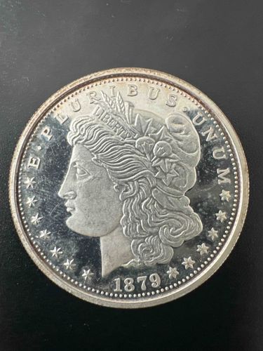 This item is an 1879 Morgan Silver Dollar, an iconic United States coin minted in 90% silver and 10% copper. The obverse features a profile portrait of Lady Liberty, designed by George T. Morgan, wearing a Phrygian cap adorned with wheat and cotton blossoms, with a coronet inscribed with 'LIBERTY'. The date 1879 is visible at the bottom, flanked by thirteen stars representing the original colonies. Along the upper rim, the Latin motto 'E PLURIBUS UNUM' is clearly embossed. The physical condition appears to be in the Extremely Fine (XF) to About Uncirculated (AU) range, showing sharp details in the hair and cap, though there is evident surface wear and micro-abrasions in the fields. A notable characteristic is the dark, irregular toning or spotting visible in the right field and around the stars, which may indicate past exposure or natural oxidation. The coin possesses a reeded edge and measures approximately 38.1 millimeters in diameter. There are no immediate signs of significant cleaning, but the presence of small 'bag marks' suggests it was stored loosely with other coins. The craftsmanship displays the high relief typical of late 19th-century American coinage.