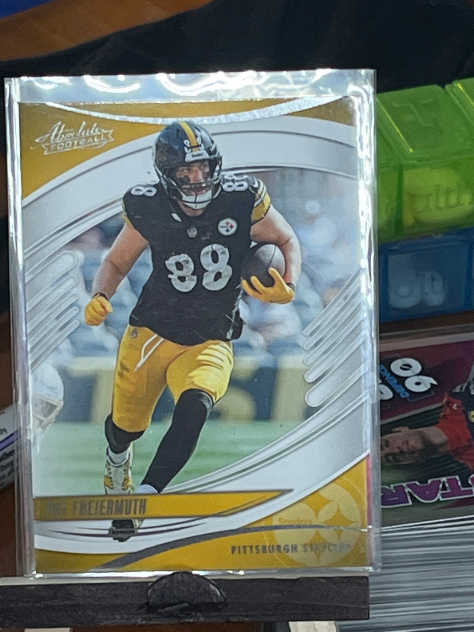 This is a 2021 Panini Absolute Football trading card featuring Pat Freiermuth, tight end for the Pittsburgh Steelers. The card depicts Freiermuth in an action pose, carrying a football and wearing his black and yellow Steelers home uniform with jersey number 88. This specific edition is a gold-foiled parallel version, identified by the metallic gold decorative borders at the top and bottom of the card face. The 'Absolute Football' brand logo is situated in the upper-left corner. The player's name, 'Pat Freiermuth,' and the team name, 'Pittsburgh Steelers,' are printed on a gold banner near the bottom. The card appears to be standard 2.5 x 3.5 inches, constructed from thick premium cardstock with a glossy finish. It is currently housed in a protective clear plastic penny sleeve and top-loader, which has some surface glare. The centering appears slightly heavy toward the left margin. The corners, as seen through the sleeve, appear sharp, and there are no obvious surface scratches or creases visible based on the high-gloss reflection. This card dates to 2021, marking Freiermuth's rookie season in the NFL.