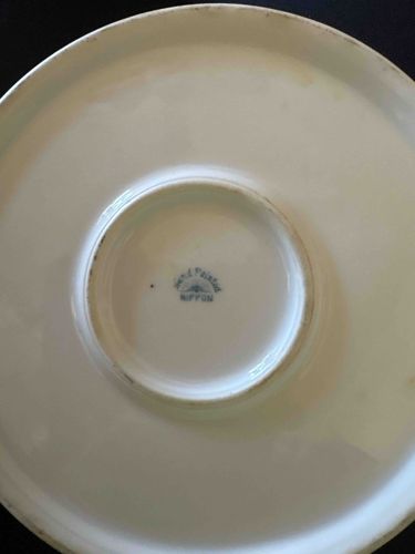 This item is the base of a hand-painted Nippon porcelain saucer or small plate, showcasing the reverse side. The piece is constructed from fine white translucent porcelain, a hallmark of Japanese ceramic production for the export market. The central feature is the blue underglaze backstamp which includes a rising sun or 'm-in-wreath' variation mark accompanied by the words 'Hand Painted' and 'NIPPON'. This specific marking indicates the piece was manufactured in Japan, likely between 1891 and 1921, to comply with the McKinley Tariff Act. Physically, the item features a prominent circular unglazed foot rim which shows evidence of shelf wear and minor discoloration characteristic of its age. The glaze appears bright and reflective, though there are visible manufacturing irregularities such as small dark firing specks (often called 'pepper spots') and minor pitting. Some light surface staining or oxidation is present along the outer edge and near the foot. The overall craftsmanship suggests a high-quality production standard typical of early 20th-century Japanese export wares intended for Western markets.