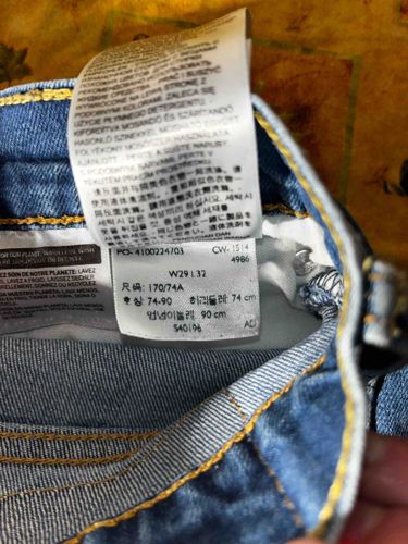 This item is a pair of authentic blue denim jeans, specifically identified by the internal care and sizing labels characteristic of modern Levi Strauss & Co. manufacturing. The denim features a classic medium indigo wash with a visible diagonal twill weave and distinctive gold-toned (yellow-orange) topstitching along the waistband and pocket lining. The construction includes a heavy-duty waistband with a metal rivet visible near the pocket bag area. The internal white satin-finish labels provide technical specifications, including several international size conversions and care instructions in multiple languages. The primary sizing label identifies the dimensions as W29 L32 (29-inch waist, 32-inch inseam) with additional Asian-market sizing equivalents such as 170/74A. Notable manufacturing codes on the tag include 'CW-1514', suggesting a production date around week 15 of 2014. The jeans appear to be in good pre-owned condition, showing standard signs of wear such as slight fading on the denim surface and some softening of the fabric tags, but no structural damage or significant fraying is visible in the provided view. The craftsmanship is consistent with high-volume commercial production, featuring reinforced stitching and standardized hardware typical of early 21st-century contemporary casual apparel.
