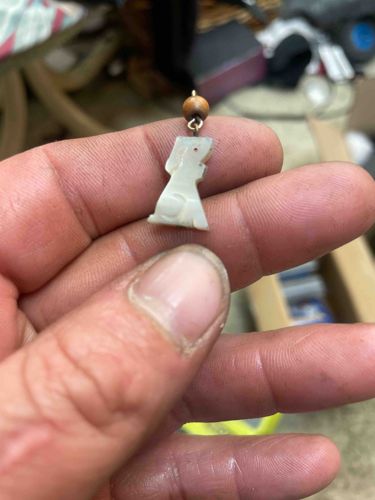 This item is a small, hand-carved pendant depicting a stylized sitting rabbit, likely made of celadon or light green nephrite jade. The carving is approximately 1.5 to 2 centimeters in height, featuring a matte to semi-translucent finish with natural stone veining visible on the lower section. The silhouette is minimalist, showing long ears and a rounded haunch characteristic of Chinese zodiac-inspired jewelry. It is suspended from a simple metal wire bail topped with a round, polished wooden or coral-toned bead. The material shows a soft waxy luster and lacks the glassy shine of modern synthetics, suggesting an older, hand-finished production. In terms of condition, the piece shows edges that have been softened by wear, indicating it may have been handled or worn frequently. There are no significant cracks or chips visible, though a small dark inclusion or 'beauty mark' is present near the top head section, which is a natural characteristic of the stone. The style is reminiscent of mid-20th-century export jewelry or folk-style amulets. The craftsmanship is of a simple, vernacular quality rather than high-end imperial jadeite, focusing on symbolic representation over anatomical realism.