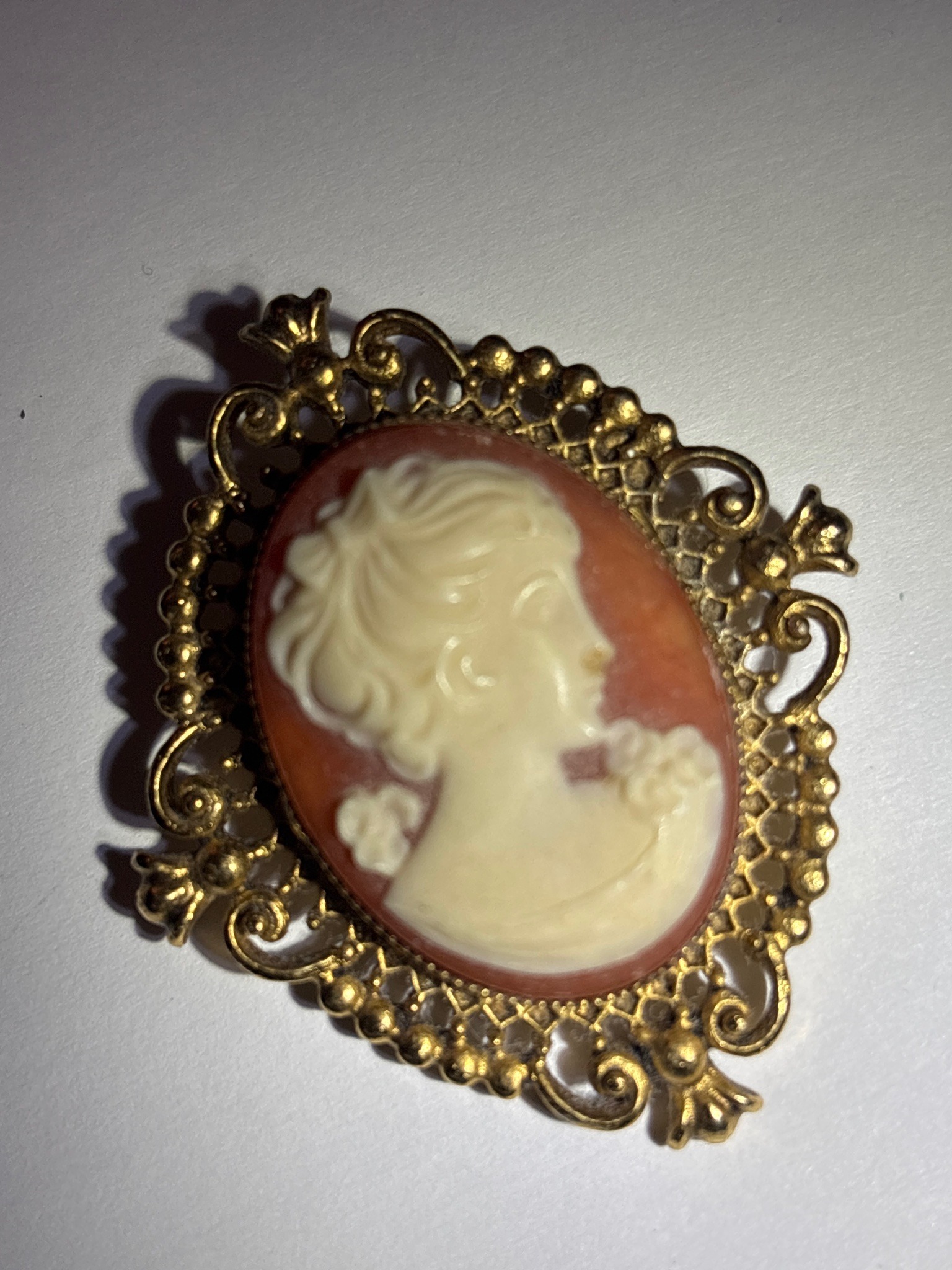 This item is a vintage-style oval cameo featuring a classical female profile, likely a rendering of a Victorian-style lady or a mythological figure. The cameo depicts a woman in high relief with intricately styled hair and a floral accent at the shoulder. The central element appears to be molded celluloid or hard plastic, set against a reddish-brown or carnelian-colored background. The decorative frame is constructed from a gold-toned base metal, possibly brass, featuring elaborate openwork filigree. The frame is designed with swirling rococo-style scrolls, beaded accents, and four distinct floral or fleur-de-lis projections at the primary axes. Based on the uniform molding of the central figure and the casting marks visible in the metalwork, this is a commemorative or mid-century costume piece rather than a hand-carved shell antique. The metal displays a heavy gold-colored patina with minor darkening in the recessed areas, which is consistent with age and typical of 1950s-1970s costume jewelry. The overall construction suggests a dual-purpose piece that could serve as both a brooch and a decorative pendant. The craftsmanship is of standard mass-production quality, intended to mimic higher-end Victorian heirlooms.