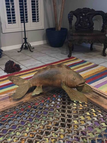 This large-scale decorative sculpture depicts a Koi or Carp fish, meticulously cast in solid brass. The piece showcases significant size, likely measuring between 18 to 24 inches in length, and is characterized by its dynamic, fluid posing. The physical construction features a heavy, sand-cast metal body with detailed scales, a prominent dorsal fin, and large, sweeping pectoral and caudal (tail) fins that are splayed to allow the item to stand independently on a flat surface. The coloration is a deep, aged bronze-to-brass tarnish, featuring a heavy natural patina with visible oxidation and verdigris (greenish discharge) particularly in the recessed areas of the fins and scales. Structurally, the fish shows no major fractures, though there are visible surface abrasions, dark spotting consistent with age, and a dulling of the original polished metal. The style suggests mid-20th-century craftsmanship, possibly of East Asian (likely Japanese or Chinese) origin, influenced by traditional motifs of luck and perseverance. The quality is indicative of a high-end decorative art piece rather than a mass-market reproduction, evidenced by the weight, the depth of the casting, and the expressive, realistic rendering of the fish's head and eyes. There are no obvious maker's marks visible on the surface, which is common for these vintage brass cast items. The overall condition is good vintage state, where the heavy oxidation adds to its character and authenticity as an older decorative object.
