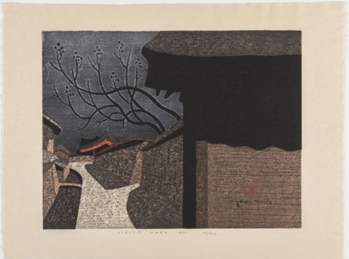 Saito Kiyoshi (Japanese, 1907-1997) Horyu-ji, Nara, 1971 Woodblock print embellished with silver metallic and mica 15-1/4 x 20-1/2 inches (38.7 x 52.1 cm) (sheet) Ed. 65/200 Signed with artist's seal within composition, title, numbered, and dated in pencil lower margin