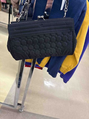 This item is a medium-sized, black quilted fabric shoulder bag featuring a classic kiss-lock or claps-frame closure. The exterior body displays a complex quilted pattern, primarily consisting of a repetitive circular or scalloped stitch motif on the main panel, complemented by horizontal linear quilting along the top flap area and radiating fan-like stitching at the bottom corners. The material appears to be a durable synthetic or cotton-blend textile with a matte finish. It is equipped with a silver-tone metal chain shoulder strap interwoven with black fabric or leather, attached to the frame via metal loops. The central closure consists of two polished silver-tone metal spheres that snap together. Geometrically, the bag has a structured, rectangular silhouette with slightly rounded edges. Though no specific maker's mark is visible on the exterior, the design evokes a mid-to-late 20th-century aesthetic, likely influenced by traditional evening bag styles. The condition appears fair to good for a pre-owned item; there is visible light lint accumulation and slight frictional wear on the fabric surface, common for soft-sided textile bags. The stitching remains intact across most surfaces, and the metal hardware retains its luster without significant pitting or corrosion visible in the image.