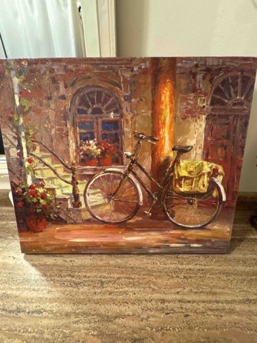 This is a horizontal rectangular oil painting on a gallery-wrapped canvas, measuring approximately 16x20 inches. The artwork depicts a vintage step-through bicycle with a prominent yellow pannier or basket, parked in front of a rustic architectural facade. The color palette is dominated by warm ochre, burnt sienna, and deep reds, accented by the bright yellow of the bike bag and small bursts of floral color in the window boxes and foreground. The painting is executed in an impressionist or neo-impressionist style, characterized by heavy impasto and visible, textured brushstrokes that create a sense of depth and movement. Notable features include arched windows with mullions and a stone staircase with a wrought-iron railing to the left. The lighting appears to come from the side, casting soft shadows and highlighting a central vertical column. Regarding condition, the canvas edges show minor abrasions consistent with shelf wear, and there is a slight scuff on the top edge. There are no visible signatures on the front of the canvas, which is common for contemporary décor art or student works from the late 20th to early 21st century. The craftsmanship indicates a commercial decorative level of quality rather than a fine art gallery piece, likely produced for home interior design markets.