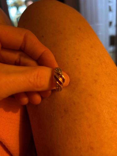 This item is a decorative ring, likely crafted from 10k or 14k yellow gold based on its warm yellow luster. The design features a modern, bypass or 'swirl' style mounting that showcases three distinct diagonal bands. The central band is channel-set with dark red gemstones, most likely rubies, which possess a round or square cut. Hugging this central channel are two outer bands, or 'shoulders,' that are pavé-set with small, round-cut clear stones, presumably diamonds or high-grade cubic zirconia. The craftsmanship illustrates a machine-cast production common in late 20th-century jewelry, possibly from the 1980s or 1990s. The ring appears to be in fair to good condition, showing typical surface scratches and light wear on the metal shank from previous use. No specific maker's marks are visible in the photograph, but such pieces often contain internal stamps for gold purity and manufacturer hallmarks. The stones seem securely seated within their settings, though a professional cleaning would enhance the brilliance of both the rubies and clear accent stones. The overall aesthetic is elegant and classic for its period.