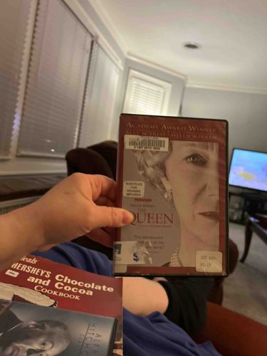 This item is a physical DVD release of the 2006 film 'The Queen,' starring Helen Mirren. The item is housed in a standard black plastic amaray-style keepcase with a clear plastic overlay holding the printed paper insert. The front cover features a close-up portrait of Helen Mirren as Queen Elizabeth II with a distinct red and cream color palette. Text at the top highlights Mirren's Academy Award win for Best Actress. Noteworthy physical indicators include several white adhesive labels on the exterior: a barcode sticker at the top (likely a library or inventory tracking tag), a smaller square sticker indicating the film is subtitled for the hearing impaired, and a partially torn white sticker at the bottom left. The case is wrapped in a thin, somewhat wrinkled plastic laminate or third-party shrink wrap, suggesting it was preserved for institutional use. The overall condition shows signs of heavy handling common with ex-library or rental stock, including adhesive residue, surface scuffs on the plastic, and minor corner wear on the paper insert. As a Miramax and Path production, this disc was manufactured around 2007 for the home video market. The presence of multiple inventory tags and a PG-13 rating sticker on the bottom right corner confirms its history as an institutional circulating copy rather than a pristine collector's edition.
