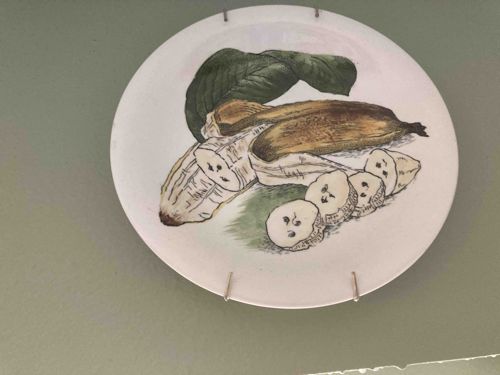 A circular ceramic plate featuring a central botanical-style illustration of bananas. The artwork depicts a cluster of bananas, including one whole unpeeled fruit, one partially peeled banana, and four distinct slices. The color palette consists of earthy browns, ochre yellows, and deep forest greens for the oversized foliage in the background. The style is reminiscent of naturalist illustrations from the mid-20th century, characterized by fine black line work and realistic shading. The plate is constructed from cream-colored glazed ceramic or earthenware. It is currently mounted for display using a four-prong spring-loaded metal wire plate hanger. While no maker's mark is visible from the front, the glaze appears smooth with minor localized crazing, which is typical for vintage glazed pottery. The illustration is likely a transfer print with hand-painted accents or a high-quality lithograph application. No significant chips or cracks are visible on the front surface, though the edges are partially obscured by the metal hanger. This piece represents a mid-to-late 20th-century decorative aesthetic often found in kitchen or dining room decor, leaning towards the traditional or country-style genre.