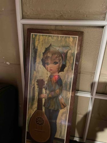 Vintage Mid-Century Big-Eyed Jester Girl with Lute Print