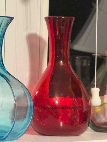 This is a mid-sized decorative bud vase crafted from vibrant ruby red translucent glass. The vessel features a classic bulbous, teardrop-shaped body that tapers gracefully into a long, slender neck, terminating in a slightly flared rim. The piece displays the characteristic organic qualities of hand-blown or mold-blown glass art, with subtle variations in glass thickness evident in the light refraction through the base. The color is a deep, consistent crimson, likely achieved through the addition of gold chloride or selenium during the manufacturing process. The surface possesses a high-gloss finish that reflects light smoothly, indicating a fire-polished rim and exterior. While no maker's marks or signatures are visible in the current view, the silhouette is consistent with Mid-Century Modern or late 20th-century decorative glassware styles frequently produced by companies like Blenko, Kanawha, or Viking Glass. The item appears to be in excellent vintage condition with no visible chips, cracks, or significant surface scratches. The base appears stable and flat, typical of high-quality decorative pieces from the 1960s-1980s era. The craftsmanship is evidenced by the symmetry of the neck and the clarity of the glass, free from excessive air bubbles or inclusions.