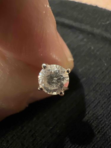 This item is a single stud earring featuring a round brilliant cut colorless gemstone, likely a diamond, secured in a classic four-prong basket setting. The metal setting appears to be a white precious metal, such as 14k or 18k white gold or platinum, though no hallmark is visible in the provided angle. The stone exhibits a significant amount of 'salt and pepper' inclusions or internal fractures visible to the naked eye, particularly toward the center of the table, which suggests a lower clarity grade (likely in the I1 to I3 range). The cut is a modern round brilliant, characterized by its numerous facets designed to maximize light return. The prongs are rounded and appear securely positioned, holding the stone at the cardinal points. Regarding condition, the stone shows some surface grime and potential skin oil buildup that obscures its natural brilliance, requiring a professional cleaning to fully assess surface integrity. The style is a timeless, contemporary staple of fine jewelry, likely manufactured within the last 20-30 years. The overall craftsmanship is standard commercial quality, consistent with mass-produced fine jewelry rather than a custom artisan piece.