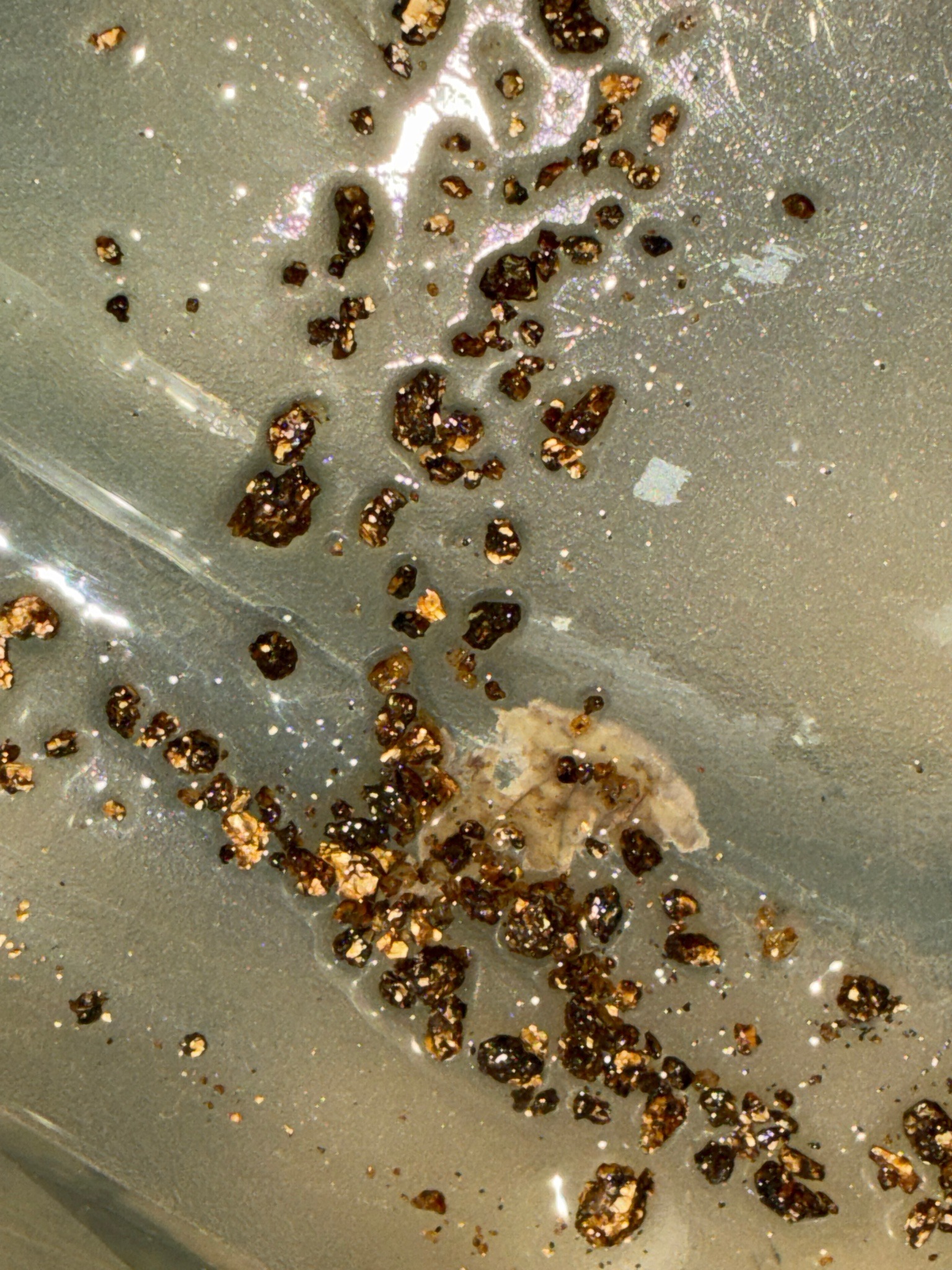 The image presents a collection of irregularly shaped particulate matter scattered across a reflective, iridescent, and semi-translucent substrate. The particles vary in color from deep, obsidian black to a toasted amber-brown, with some exhibiting a glitter-like, gold-toned shimmer that suggests crystalline inclusions or metallic flake. Physically, the particles lack internal symmetry, appearing as brittle, crushed fragments or granular aggregates with rough, porous surface textures. The sizes appear microscopic or near-microscopic, given the depth of field and the visibility of surface scratches on the background. The substrate features a distinct diagonal ridge and shows signs of mechanical wear, indicated by fine linear scratches and abrasions. A yellowish, calcified or waxy residue is visible near the center-right clusters, which may act as a binding agent or indicate biological or chemical degradation. These particles could represent mineral specimens like vermiculite or mica, organic residue such as dried resin, or industrial byproducts like metallic slag. The overall condition suggests environmental exposure or mechanical disintegration of a larger solid structure. No maker's marks or signatures are present, as this appears to be naturally occurring or incidentally created debris rather than a manufactured object.