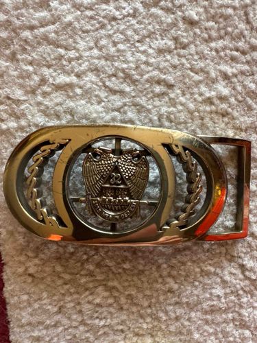 Brass colored belt buckle with what appears to be a shield with two eagle wings forming the shield, the number 32 in a triangle and the words that appeared to be in a foreign language read SPES MEA IN DEO EST