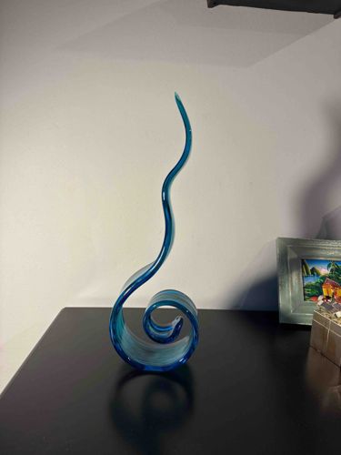 This contemporary hand-blown glass sculpture exhibits a dynamic, vertical S-curve silhouette that terminates in a tight spiral base. The piece is crafted from a vibrant cerulean or cyan-tinted translucent glass, featuring subtle internal striations and variations in color saturation that suggest a 'sommerso' or hand-pulled technique. The form begins with a broad, flat ribbon-like base that curls inward, providing stability, and then tapers elegantly into a slender, undulating spire reaching upward. Its organic shape mimics a rising flame or a cresting ocean wave. The texture appears smooth and high-gloss, indicative of quality fire-polishing. While no visible maker's marks or signatures are apparent in the provided view, the fluid movement and balance suggest mid-to-late 20th-century Murano influence or a more recent artisan production. The condition appears excellent with no visible chips, cracks, or internal fracturing. The clarity of the glass and the precision of the taper serve as primary indicators of skilled craftsmanship. The item stands as a decorative pedestal piece, likely measuring approximately 12 to 18 inches in height based on surrounding context items.