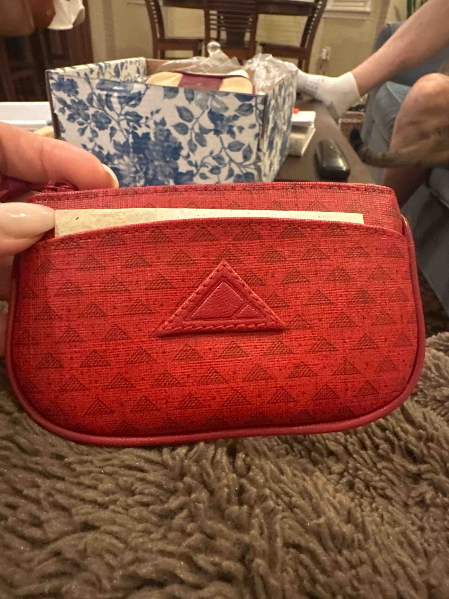 This is a small, rectangular zip-around coin purse or card holder featuring a distinctive vibrant red color palette. The exterior is crafted from a textured, possibly coated canvas or Saffiano-style leather, adorned with a repetitive printed monogram pattern consisting of small, dark red triangles. A prominent feature is the central embossed triangular leather patch sewn onto the front pocket, which characteristic of certain contemporary luxury accessory lines. The purse includes an external slip pocket for cards or receipts and a top zipper closure with a tonal red pull. The construction displays uniform tonal stitching along the perimeter and patch edges. Regarding condition, the item shows minor signs of handling but maintains its structural integrity and color vibrancy; however, faint dark spotting or surface grime is visible along the top edge near the zipper teeth. The design aesthetic suggests a modern luxury accessory, likely produced within the last 10–15 years. The craftsmanship is evidenced by the precise alignment of the printed pattern and the clean finish of the curved bottom corners, indicating a higher-quality mass-market or boutique production level.