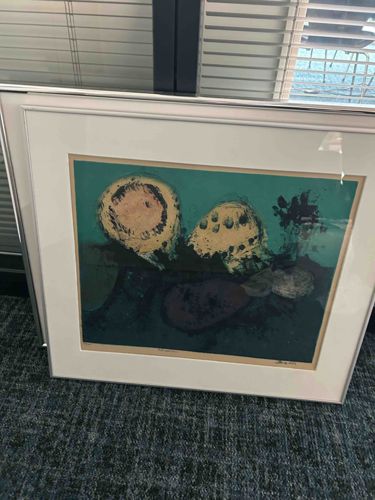 This is an original color lithograph by the Danish artist Mogens Balle (1921–1988), a key figure in the CoBrA movement. The composition features characteristic biomorphic and abstract forms, executed in a palette of deep teal-green, ochre, and dark earth tones. The piece displays Balle's signature spontaneous and expressive style, with two prominent, rounded, textured forms dominating the central field against a dark, moody background. The print is housed in a contemporary silver-toned metal frame with a wide, white archival-style mat. Notably, the work bears a visible pencil signature in the lower right margin, 'Mogens Balle', and a date that appears to be from the mid-to-late 20th century, likely the 1970s or 1980s. The lower left margin likely contains an edition number, though it is partially obscured in the photograph. The physical condition appears stable, with the paper displaying no obvious signs of foxing or water damage, though there is a slight yellowish tint at the very edge of the image where it meets the mat, suggesting minor age-related toning. The frame has minor surface scuffs consistent with standard handling. This work is a strong example of Post-War Scandinavian abstract printmaking, showcasing the imaginative and organic quality typical of Balle's mid-career output.
